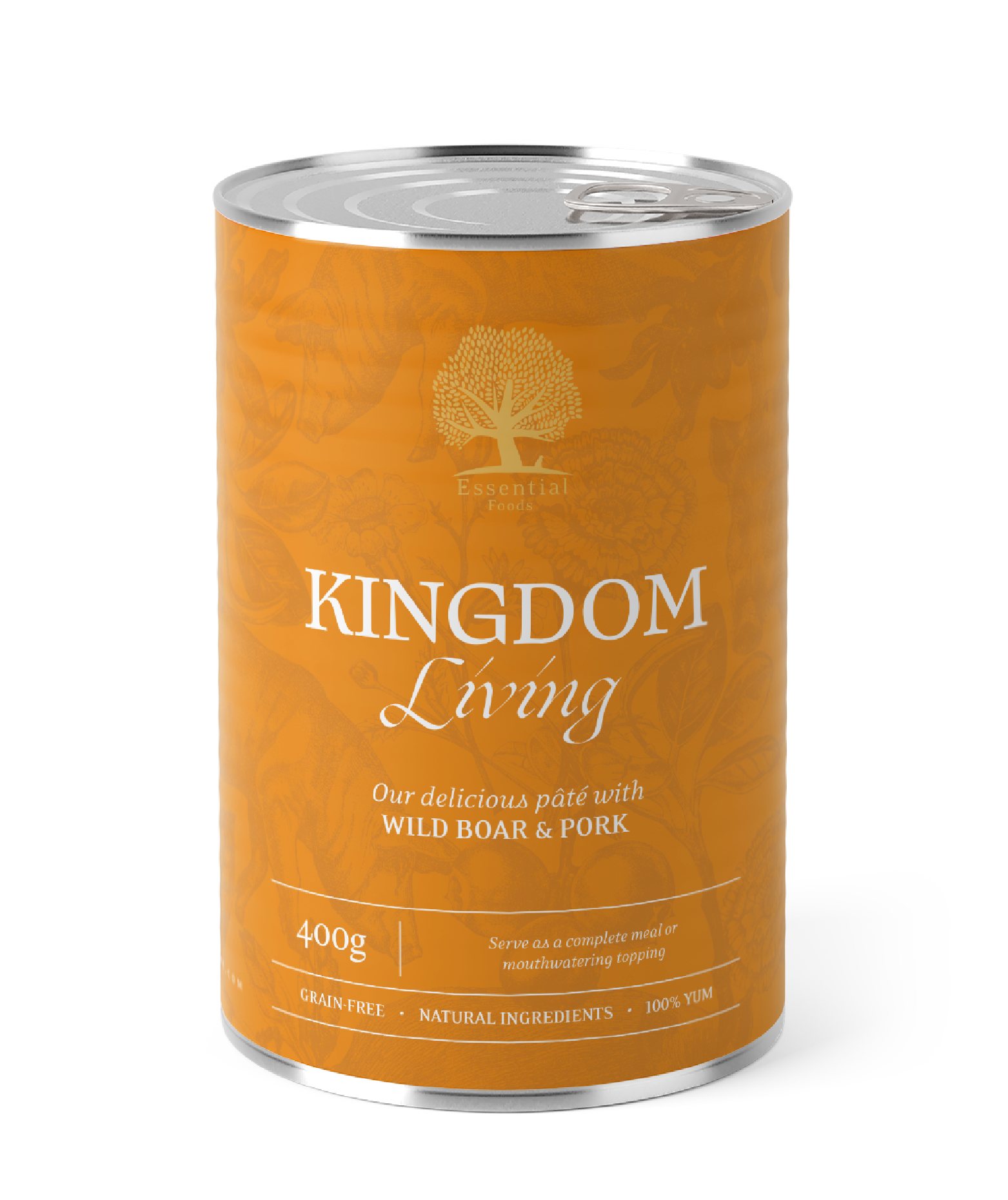 ESSENTIAL KINGDOM LIVING PATÉ är vår underbara paté med saftiga köttbitar av vildsvin och fläskkött för vuxna hundar. Serveras som komplett måltid eller härlig toppning. Den är spannmålsfri och med bara naturliga ingredienser och, vågar vi säga det, 100 % GOTT!